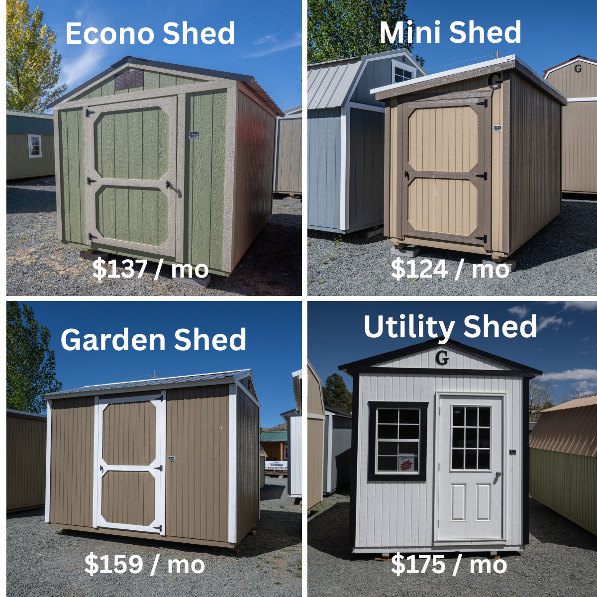 Check out several new additions to the Graceland lot in Alto NM. From our smallest 6′ x12′ Mini shed, to the 8′ x 12′ Econo